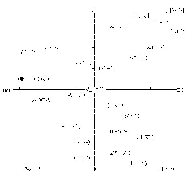 つづき。ああそうさ、更新した日数を稼ぐためさ。 というわけで、プロット図をAAで再現してみた。 やはりエロカが中央にいると別の見方をしてしまうな。 こうして見てみると、吊り目の場合は必ずしも「`´」のような組み合わせで表されるわけではないことが分かる。怒ったときの表情と見分けがつかなくなる可能性があるからだろうか。この図にはないけれど、ヤススの顔文字「( `.∀´)」は、本人も顔文字も吊り目という希有な例ということになる。 一方垂れ目のほうはわりとそのまま「´`」の組み合わせで表現されることが多いようだ。こちらはこちらで落胆したとき、辟易したときの表情と見分けがつかなくなる可能性があるはずなんだけどなぁ。 もう一つ、目が大きいとされるメンバーは、「・」「‘」という文字が使われることが多いようだ。 特殊な例としては、やはり柴ちゃんの目やミキティの目が挙げられる。 しかし、全体的に見れば、顔文字における目は実物の特徴を捉えて再現するというよりも、本人の醸し出す雰囲気やヲタの間で再構成されたキャラクターを端的に表現する役割を果たしていると考えた方がよさそう。 前述した大きな目を表す文字の例のようにある程度の模写傾向は存在するにせよ、単に似ていればよいというものではないのが顔文字の面白いところ。だって、いくら目が大きいからってごっちんの顔文字が「( ・ Д ・)」だったら、ショマキスレなんて成立しなくなりそうだし。 見た目の特徴だけでなく、それぞれのメンバーが有する(またはヲタによって付与された)キャラクターをもうまく表現できるからこそ、ハロプロの顔文字は広く受け容れられているのかもしれない。 |